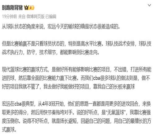 别跑刚背猪认为:从球队状态的角度来说,宏远今天的输球的确是状态很差造成的。宏远是典型的靠长板来赢球,从4年3冠开始,他们的思路一直都是用更多的进攻回合,来换取更多的得分,然后用快节奏拖垮对手。说的好听点,是“无氧篮球”,我靠比赛强度压倒你。说得不好听点,就是扬长避短,回避自己的问题,用自己的最擅长的方式赢球。