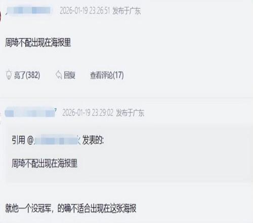 有广东球迷直接表示:周琦不配出现在海报里;评论区下方还有球迷回复了几条扎心的评论:就他一个没有冠军,的确不适合出现在这张海报。他也就在一个赛季他就打了 28 场,确实没什么关系。