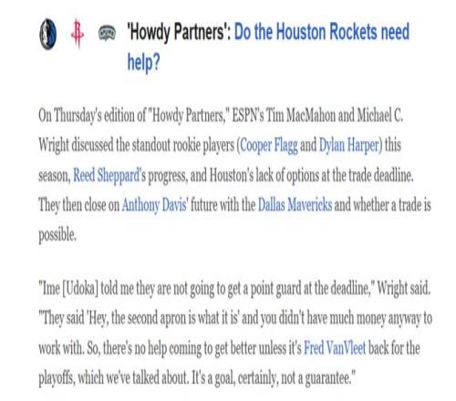 名记Chris Haynes、美媒《clutchpoints》名记Brett Siegel和美媒《cbssports》均表示,主教练的发声实际上与总经理的想法未必完全一样,火箭队的确补强意愿不强烈,但如果合适的时机出现,斯通也会有所行动。