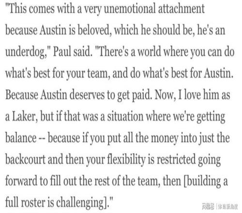 “提出这样的交易方案,需要保持绝对的冷静和理性。里夫斯堪称逆袭的典范,有时候,我们能够做出既对球队长远发展最为有利,又对里夫斯个人发展最为有利的抉择。因为从各方面来看,里夫斯都理应得到丰厚的报酬。我个人非常喜欢看他身披湖人战袍在赛场上拼搏,但如果通过这笔交易能够让球队阵容实现平衡——毕竟如果将大量资金都投入到后场球员身上,那么未来在组建完整且具有竞争力的阵容时,球队的灵活性必然会受到极大的限制。”