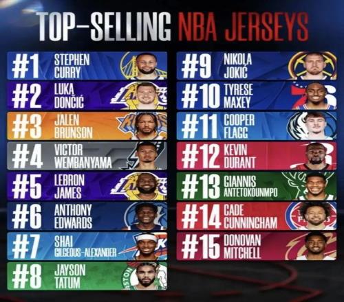 今天,NBA官方公布了25-26赛季上半赛季球员的球衣销量数据,前十分别是:库里、东契奇、布伦森、文班亚马、詹姆斯、爱德华兹、亚历山大、塔图姆、约基奇、马克西。