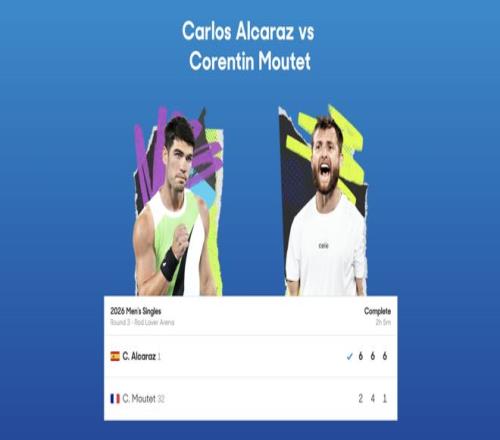 澳网男单第三轮,头号种子阿尔卡拉斯耗时2小时5分钟直落三盘以6-2、6-4、6-1轻取32号种子、法国人穆泰晋级16强。