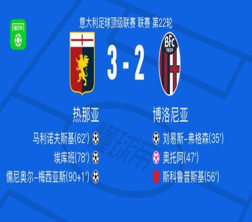 北京时间1月25日,意大利足球甲级联赛第22轮,热那亚主场对阵博洛尼亚。刘易斯-弗格森接队友助攻破门,奥托阿不慎自摆乌龙,随后马利诺夫斯基为热那亚扳回一球,埃库班在队友助攻下破门,儒尼奥尔-梅西亚斯于补时阶段再入一球。最终热那亚3比2战胜博洛尼亚。