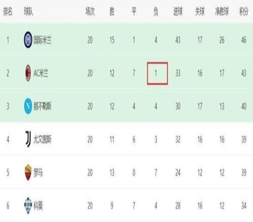 随着本场比赛AC米兰在客场完成逆转,在本赛季意甲20轮战罢的情况下,红黑军团取得12胜7平1负的战绩,目前仅落后榜首的国际米兰3分。要知道,这是球队自1994/95赛季意甲启用三分制以来,AC米兰历史上第三次做到前20轮只输1场,前两次分别是1995/96赛季和2003/04赛季,而那两个赛季,米兰最终都捧起了联赛冠军奖杯。按照这一规律来看,本赛季意甲冠军正在向红黑军团招手。