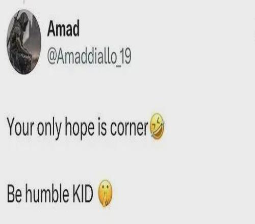 阿森纳被阿玛德抓住了“把柄”。他在社交媒体上回复一位赛前豪言“阿森纳4-0赢了我已拿到剧本”的球迷:“你的唯一希望就是角球”“低调点吧,小子”,并晒出3-2终局比分截图配文:“享受去吧,臭小子”。
